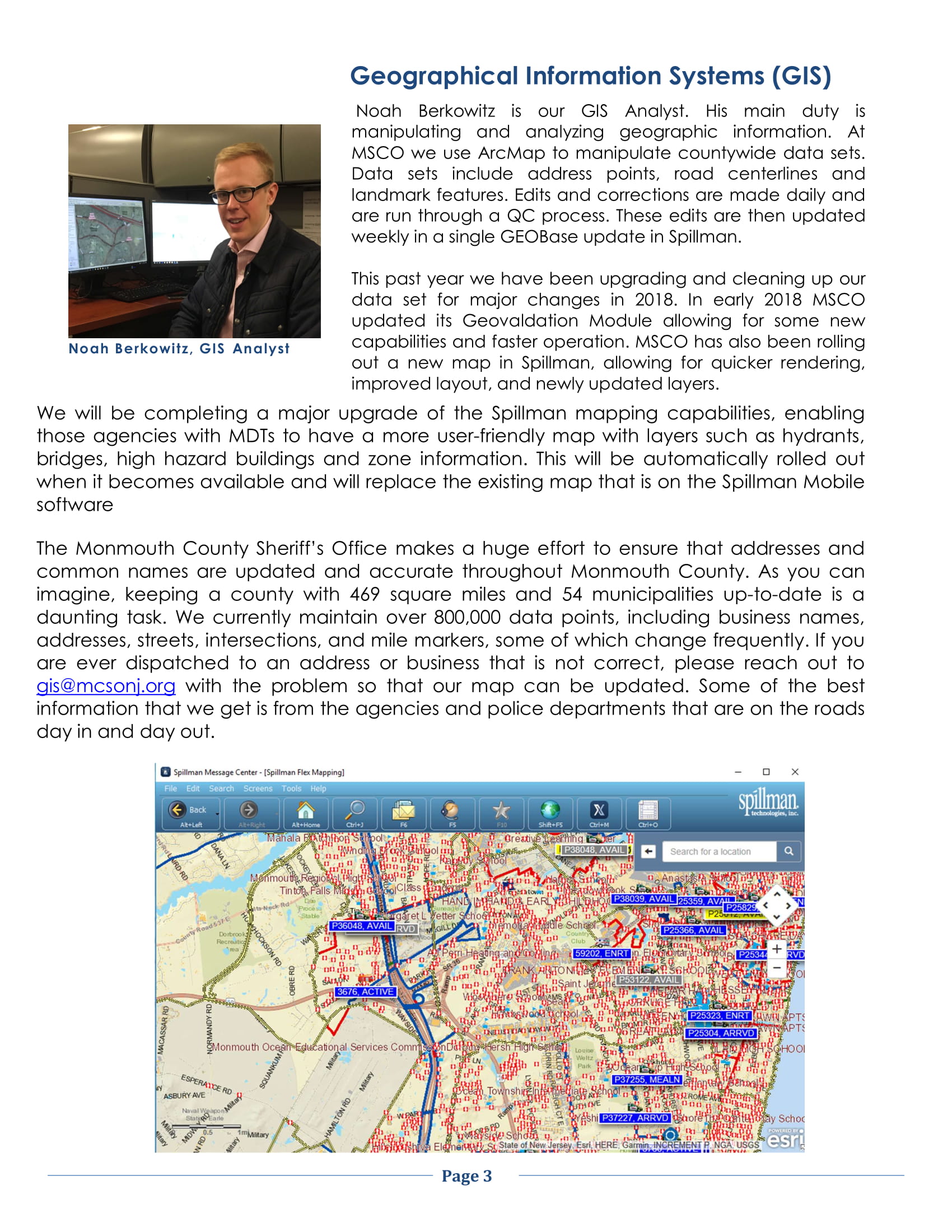 My name is Noah Berkowitz; I am a graduate of Clark University. I have a double B.S. and M.S. in GIS and Planning and graduated Cum Laude with Presidential Scholar Status. After my undergraduate education, I worked as a GIS Analyst for the Monmouth County Sheriff’s Office. I was also featured in the Monmouth County Sheriff’s Office Newsletter for my work (see below). I attended Clark University as a graduate student in the Masters of Science in GIS program. I worked as a small automation/investigation team member for the pixel-wise classification of Mangroves and pond aquaculture using Machine Learning techniques/API’s. I also worked for the Worcester Department of Health, where I led the geospatial and temporal analysis of overdoses. I implemented forms of analysis across various platforms, including ArcGIS and Google Earth Engine. I was recently awarded a Research Assistantship at the University of Nebraska-Lincoln and am currently a Ph.D. student.